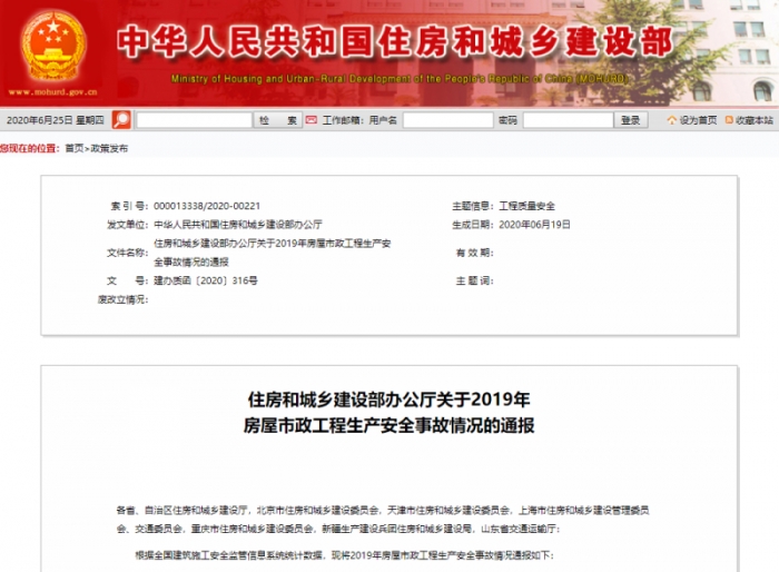 日前,住建部辦公廳下發(fā)《關(guān)于2019年房屋市政工程生產(chǎn)安全事故情況的通報》,要求,2020年,各地要深入查找本地區(qū)安全生產(chǎn)工作的薄弱環(huán)節(jié)和突出問題,推動防范化解施工安全重大風(fēng)險各項(xiàng)部署落地見效,堅(jiān)決遏制重特大事故。