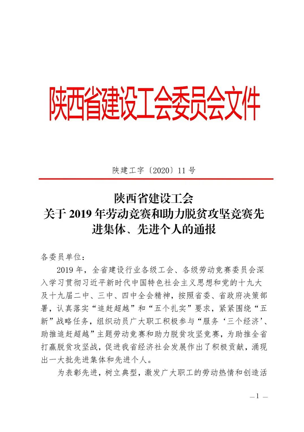 | 公司工會(huì)榮獲“陜西省建設(shè)系統(tǒng)勞動(dòng)競賽先進(jìn)集體”稱號(hào) |