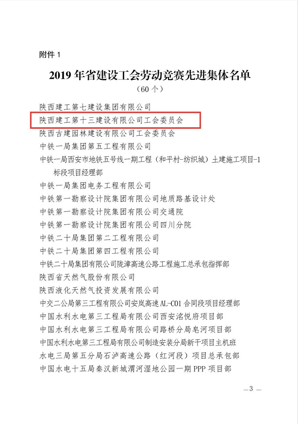 日前,陜西省建設(shè)工會(huì)通報(bào)表彰2019年勞動(dòng)競賽和助力脫貧攻堅(jiān)競賽先進(jìn)集體、先進(jìn)個(gè)人。陜建十三建公司工會(huì)委員會(huì)榮獲“2019年陜西省建設(shè)系統(tǒng)勞動(dòng)競賽先進(jìn)集體”稱號(hào)。